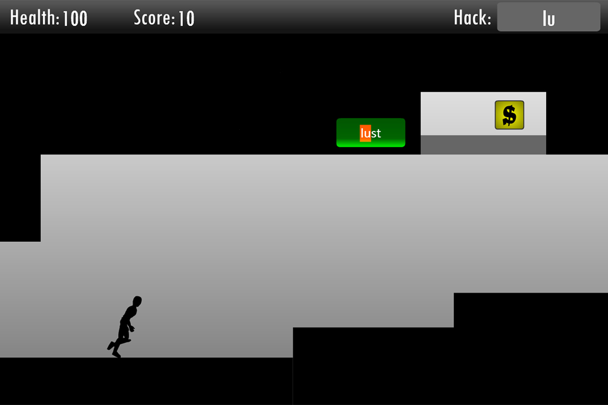 Hack is a speed-typing 2D platform educational game where players assume the role of a hacker assisting his heisting partner. It is designed to teach players touch-typing techniques in an interesting manner.