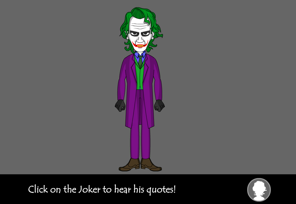 The Clickable Joker is a coloured, line-drawing rendition of The Joker from Christopher Nolan's The Dark Knight. In it, the animated character utters half a dozen of the most famous lines from the movie.